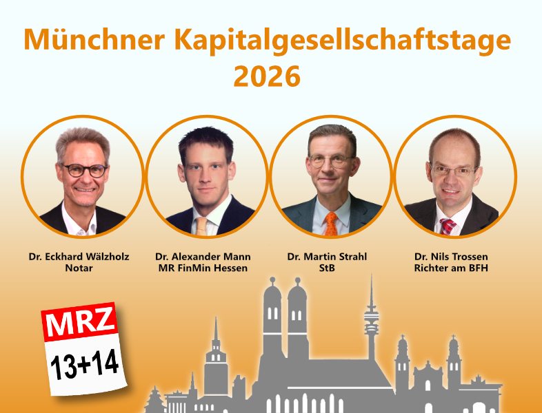 Holen Sie sich 2026 das aktuelle Know-How für die steuerliche Beratung mittelständischer Unternehmen. Die Münchner Kapitalgesellschaftstage und die Münchner Personengesellschaftstage bieten dafür ein einzigartiges Forum. Das hochkarätig besetzte Referententeam gibt Ihnen praxisnahe Handlungsempfehlungen zu den aktuellen steuerlichen Entwicklungen. Außerdem bieten die Seminare genug Zeit, um Lösungsvorschläge für Ihre Fragen zu erörtern.